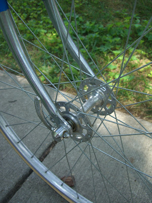 Forged dropouts with threaded M-5 eyelets, dually in the rear. They do not have an integrated derailleur hangar, unfortunately. The minor rust seen here is typical of the chrome plating on this bike, other than the problem area on one chain stay.