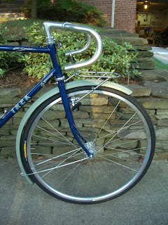 Looking closely, one can see the two small pieces of handlebar tape in between the fender and the fork. This prevents rattles. I chose blue because, well, you had to look closely...