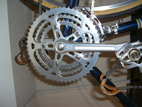 A later variant, called the Super Mighty, had cutouts on the crank spider arms where there are simply depressions on the Mighty. Due to this, a Mighty may be converted to a triple with the machining services of Elliot Bay Bicycles, who will machine a 74 mm BCD hole pattern in the spider arm depressions for a suprisingly reasonable amount.