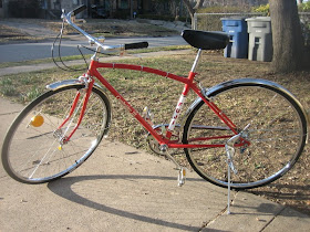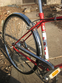 I was browsing your blog and noticed that the Royal did not appear to be represented on your site. I recently bought one and did some rudimentary work to get it roadworthy again. I submit these pictures to you of the bike in its natural state: Covered in grime from a pleasant(read: huge squall with 40 mph wind gusts) day's commute. As you can see, this is not a prime example as the frame could use new paint, the decals are faded or gone, and the front derailleur was taken off an old Roadmaster(nothing like quality parts, eh?)