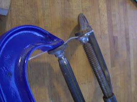 To the task we turn our attention to the undamaged strut. It has a 90 degree spiral bent into it. After determining that this feature could not be used to any advantage in the current situation, we straighten the spiral. First we clamp 2 C clamps as close to the spiral as possible: