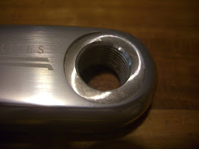 Pretty luscious units, they are. The next problem was what bottom bracket? They take a traditional square spindle, but there is a little bit of mystery surrounding the bottom brackets for these, at least according to the Peter White site. Therein lies a complicated tale about whether or not the spider has a rough or smooth inner surface, I had a hard time following it all. The Internet is similarly indecisive.