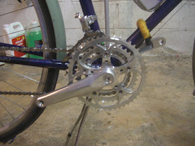 Well, that would solve the low gear problem but it introduces a few of its own. The Shimano HG61 is a beast of a cassette, weighing in at about a pound vice the half pound of the 12/27 Ultegra CS-6500. This alone isn't too much of a problem - I'm not a hard core weight weenie and the Sugino OX801D is a real lightweight at 745 grams including bottom bracket.